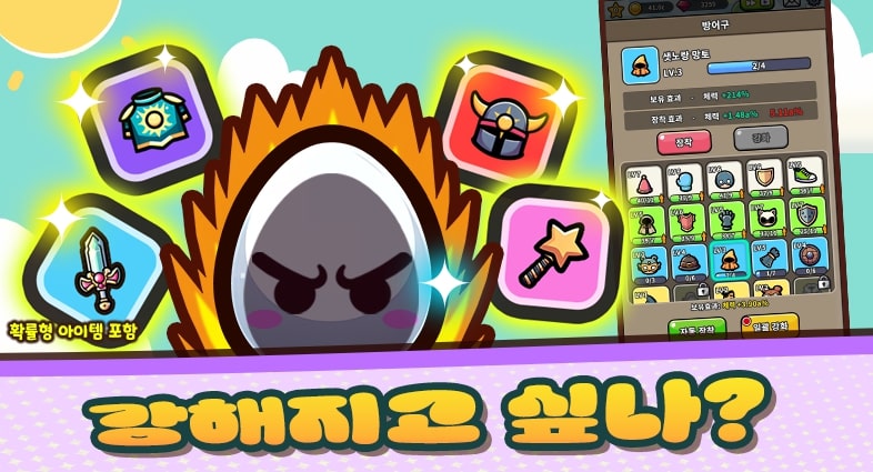 던전을 도전하여 각종 장비와 재화를 얻어 더욱 강한 달걀로 성장시킬 수 있어요.