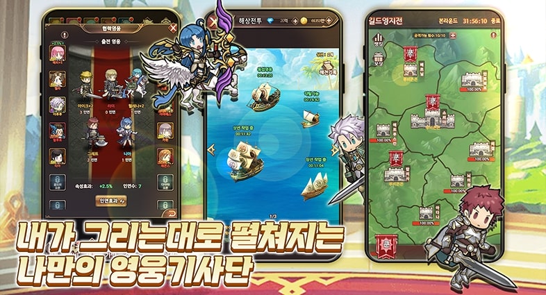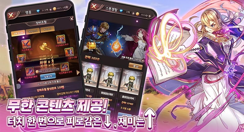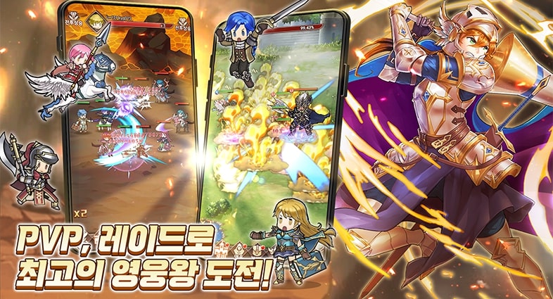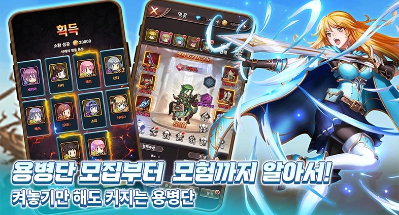 당신과 모험을 함께할 영웅들을 수집하세요! 장비와 스킬을 강화하여 강력한 영웅들로 성장 시키세요! 나만의 기사단을 육성하는 재미!