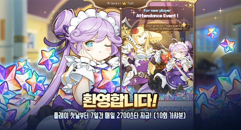 혜택 : 500스타, 영웅 소환 티켓*10, 골드 (2H)*5, 영웅 경험치(2H)*5, 공주의 티아라 조각*60 (8만원상당)